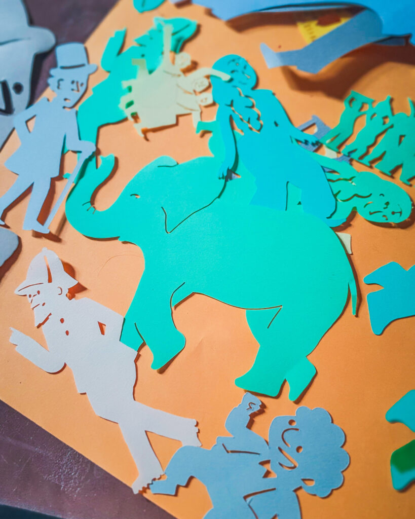 Une partie majeure du spectacle repose sur des décors et personnages en papier qui surgissent, vivent, se baladent et habillent chaque scène. Dessinés par Sofijo, ils sont ensuite passés dans une moulinette magique appelée Cricut : la machine à découper !