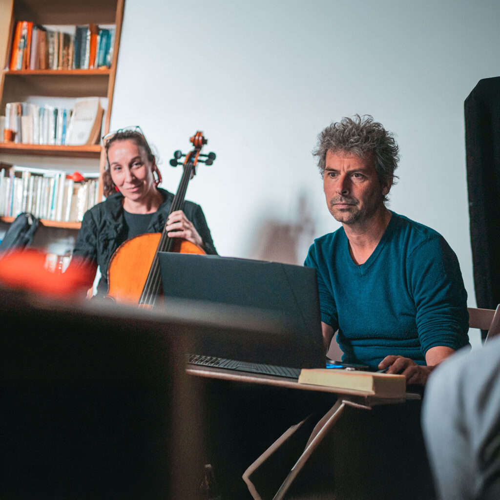 Pascale, violoncelliste qui marie la rigueur de sa formation classique à une curiosité sans limites et Xavier, guitariste touche-à-tout pour qui l’utilisation de l’outil informatique n’est pas une fin en soit mais une corde de plus à sa créativité. Ils œuvrent ensemble dans le duo «cinématique instrumental» l’Inquiétant suspendu.